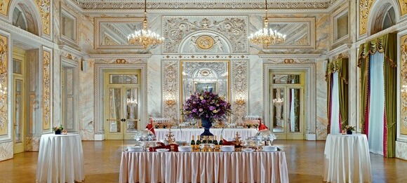 The "Salone delle Feste" is a unique wedding venue designed with a French influence refined with fine stucco work and elaborated moldings. The arches of the dazzling painted ceiling, reflecting majestic walls, create the ideal ballroom atmosphere for an unmatched wedding.