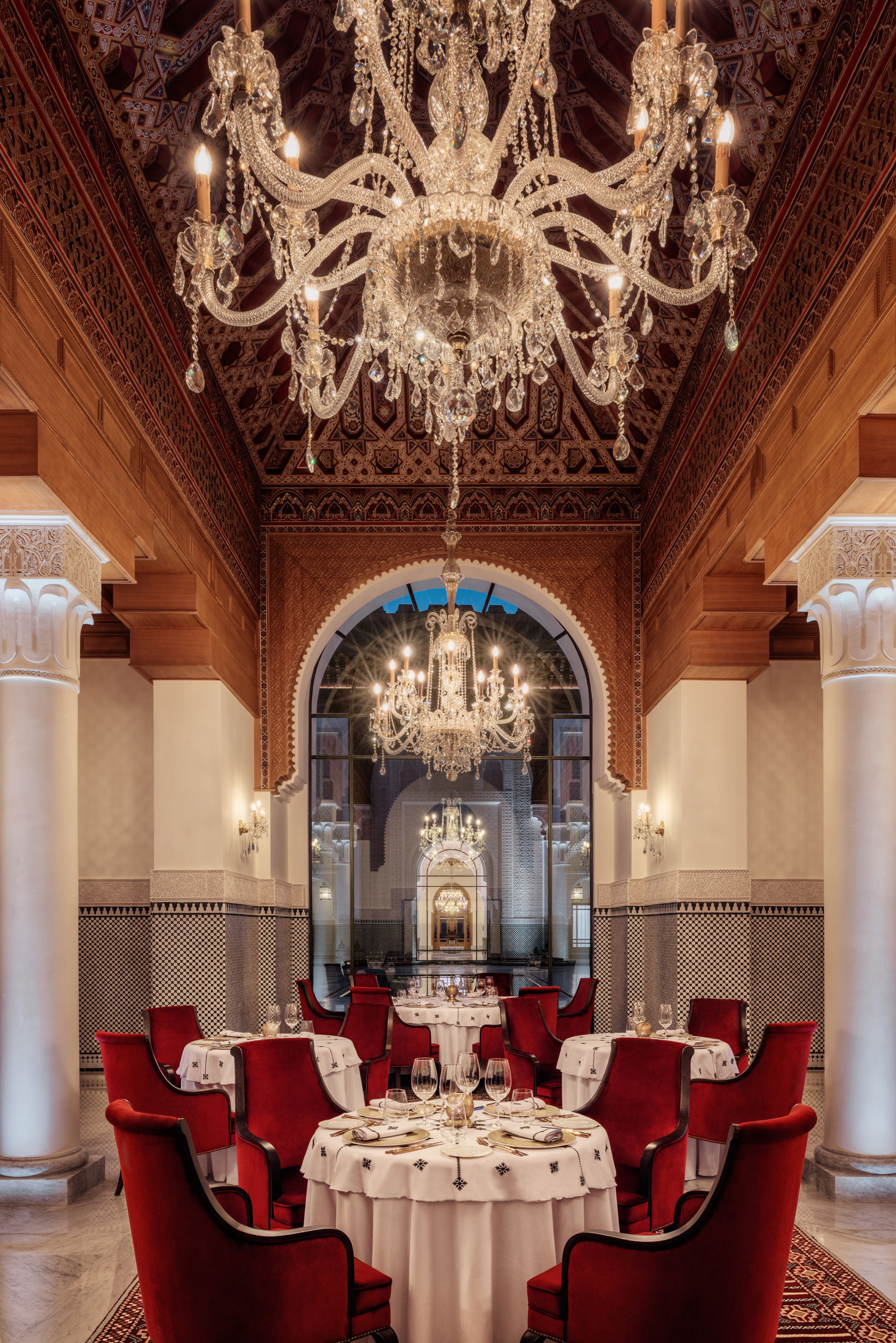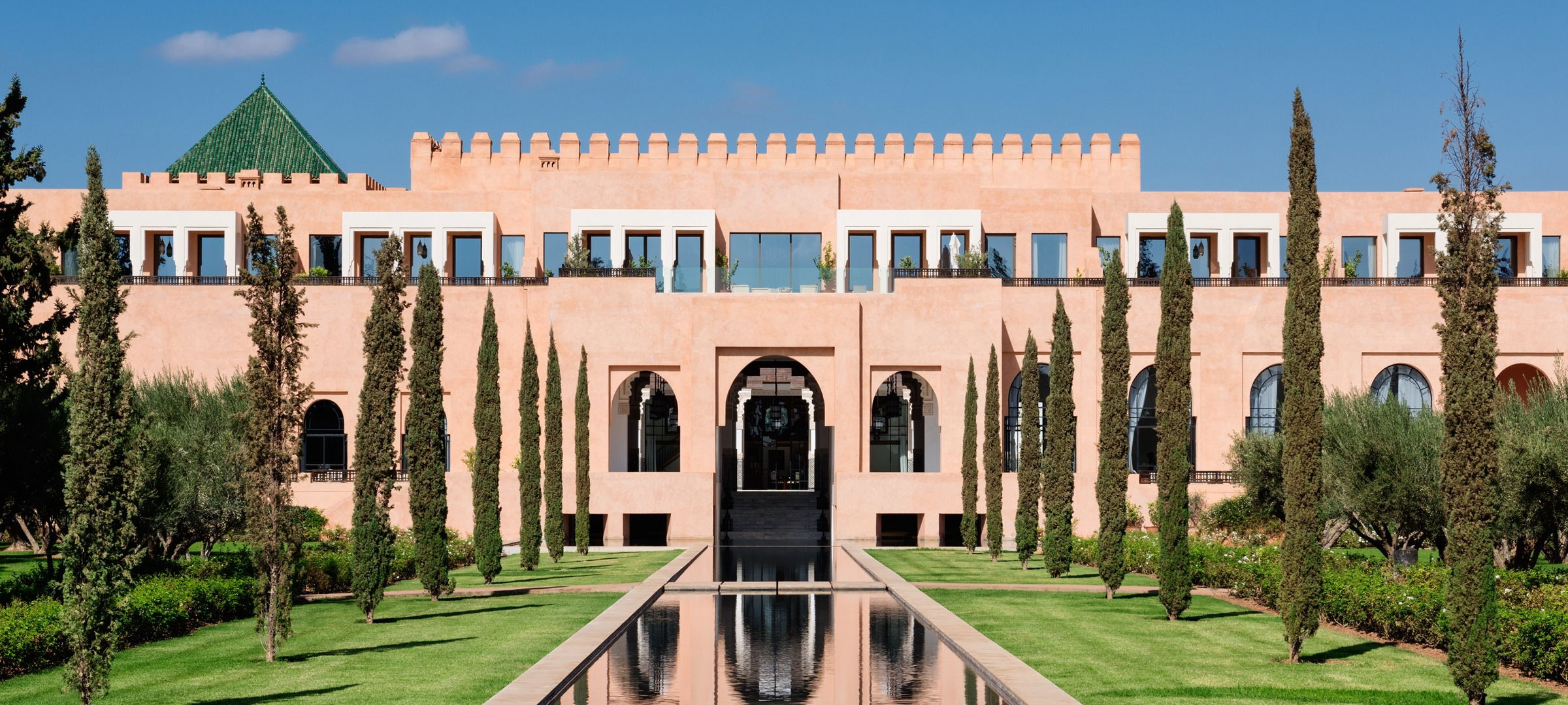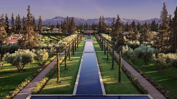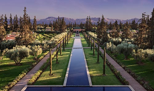 The Oberoi, Marrakech is located within twenty-eight acres of Mediterranean orchards with fragrant citrus trees and centuries old olive groves. Our five star hotel in Marrakech has beautifully landscaped gardens punctuated by water features. Its authentic architecture is inspired by palaces of ancient Morocco. The courtyard of the main building incorporates the design of the historic Medersa Ben Youssef, built in the 14th century; one of Marrakech’s most famous historic monuments. The resort offers picturesque views of the majestic snow-capped Atlas Mountains.